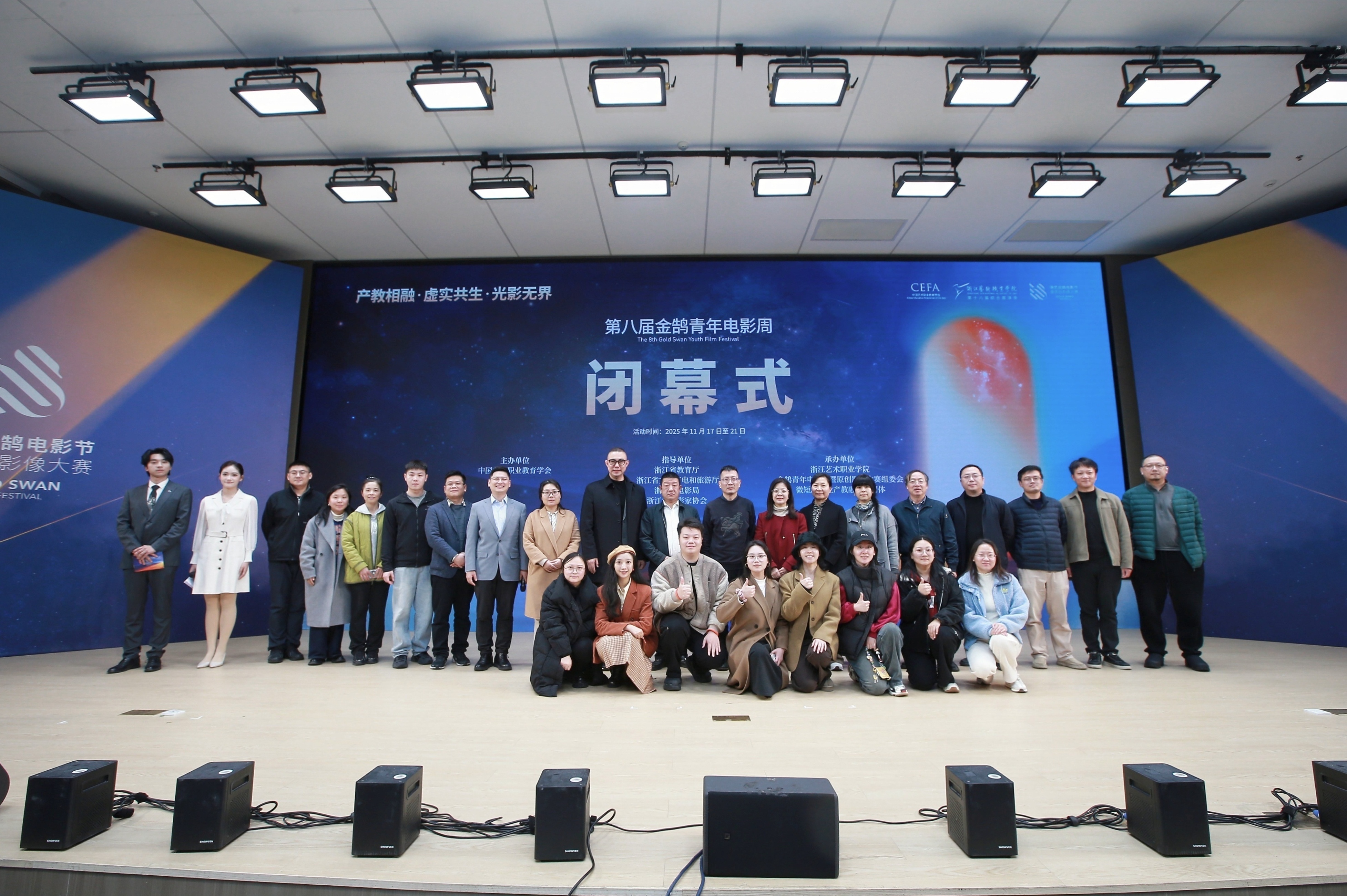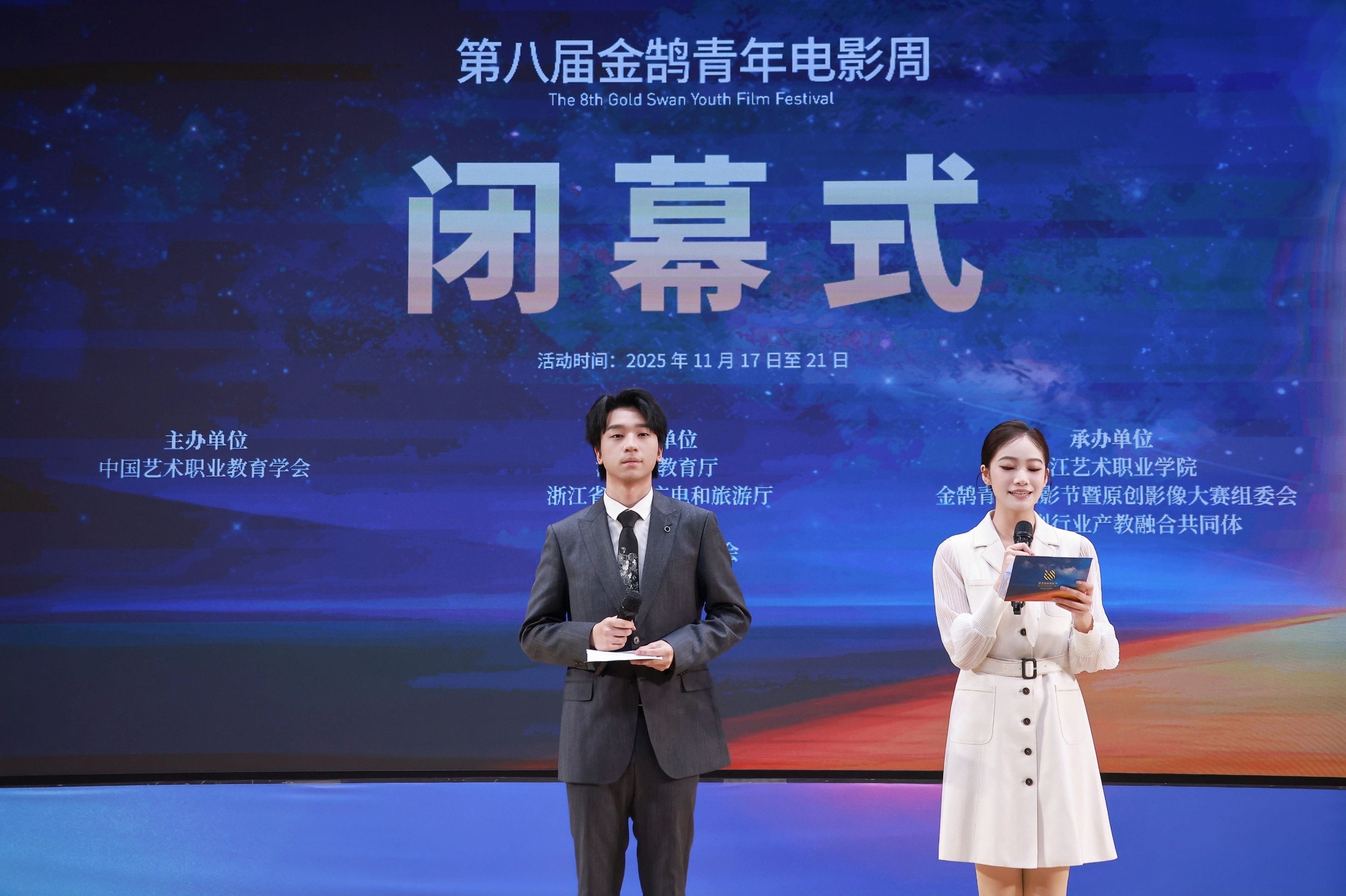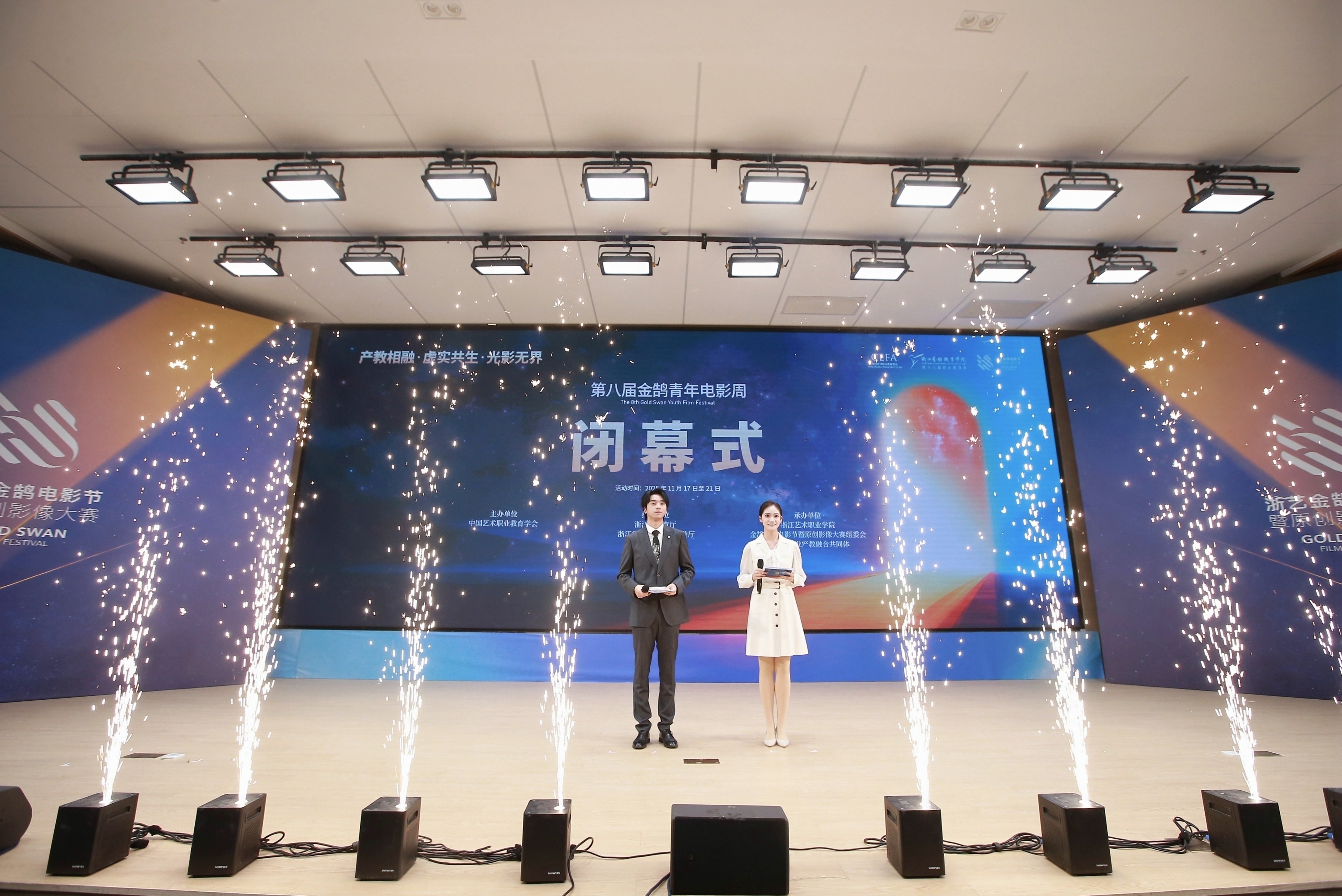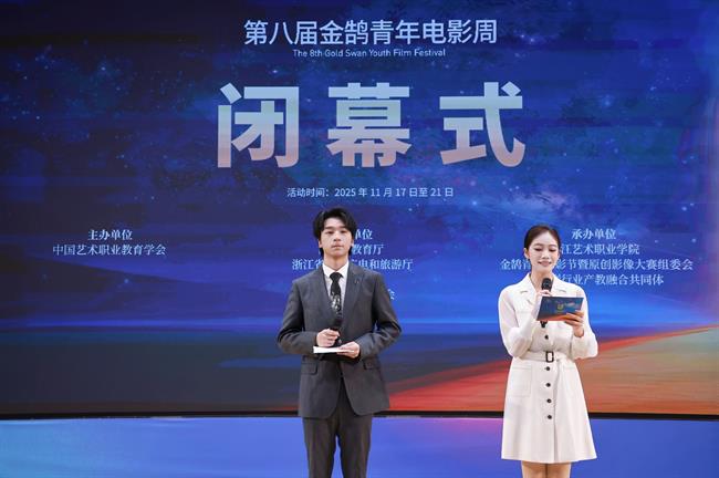 11月21日晚,由浙江省教育厅、浙江省文化广电和旅游厅、浙江省电影局、浙江省电影家协会指导,中国艺术职业教育学会主办,浙江艺术职业学院、金鹄青年电影周暨原创影像大赛组委会、微短剧行业产教融合共同体联合承办的第八届金鹄青年电影周暨原创影像大赛,在浙江艺术职业学院落幕。
