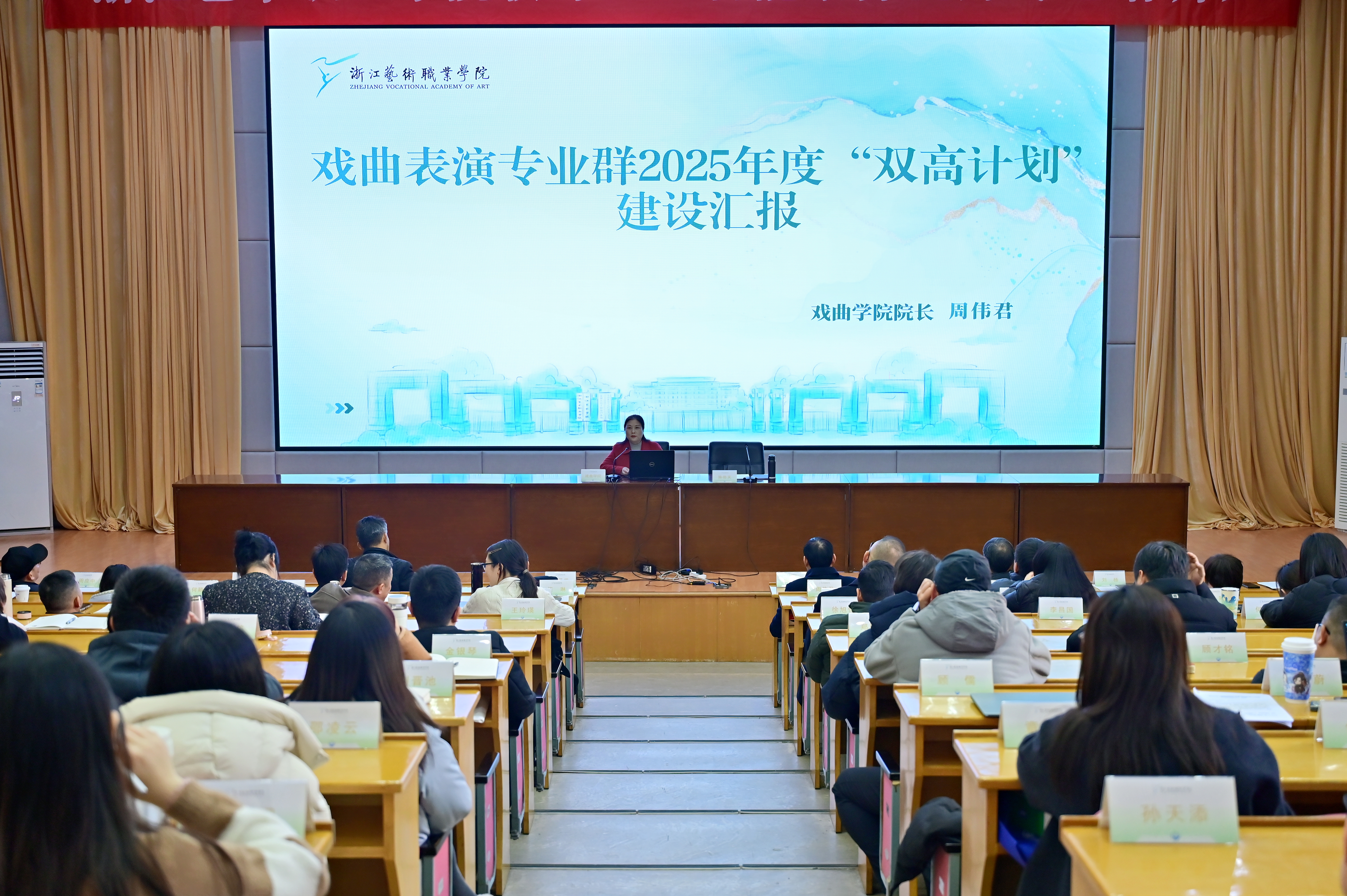 戏曲学院、戏剧影视学院作为省级“新双高”专业群建设牵头单位,分别作了专题交流,详细汇报了戏曲表演、影视多媒体技术两个专业群在人才培养模式创新、课程体系重构、师资队伍建设、产教融合深化等方面的工作进展与取得的标志性成果。