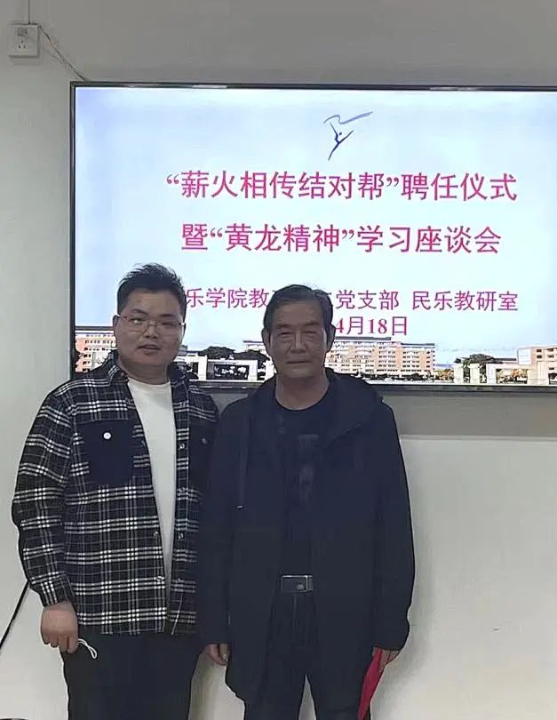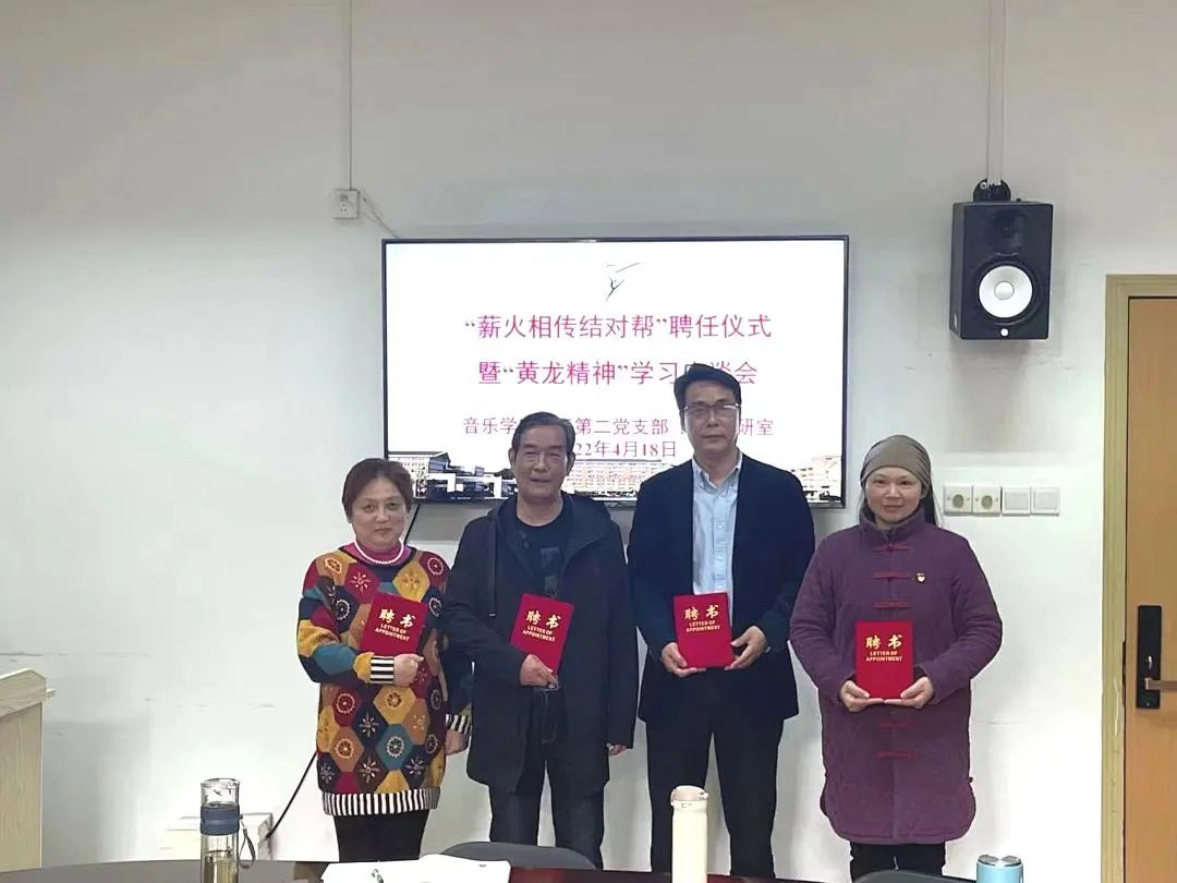 4月18日,音乐学院教工第二党支部、民乐教研室在3101党员之家举行“薪火相传结对帮”聘任仪式暨“黄龙精神”交流分享。吴樟华、朱学富、陆曙鸣、马崊等4位正高职称党员教师受聘结对4名青年教师,并作“黄龙精神”与教书育人心得分享。支部党员、民乐教研室全体教师参加。