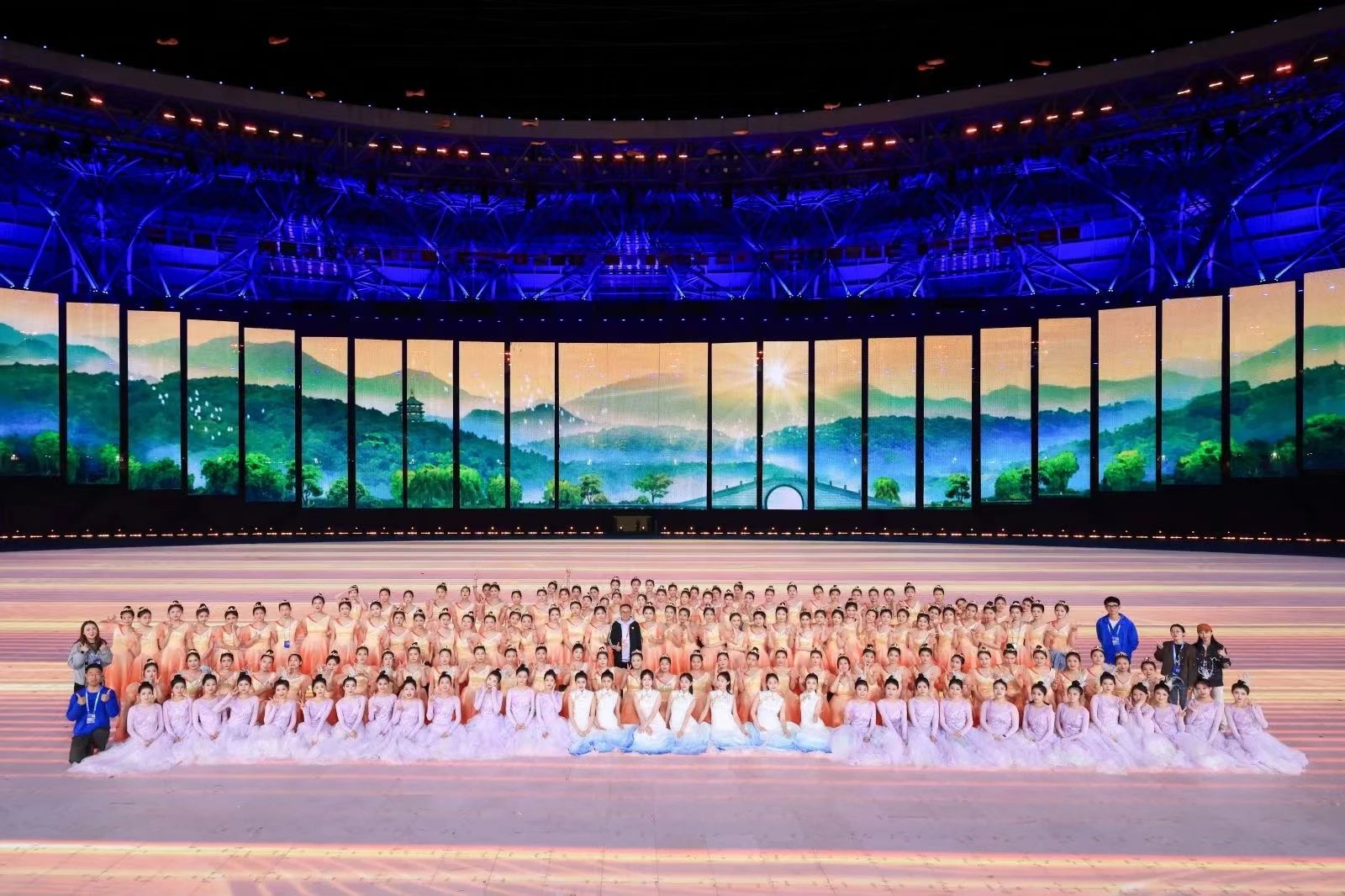 桂花是杭州的市树,也是开幕式的主要元素。舞台上,只见金桂少女和视障女孩手拉手翩翩起舞,你的美好映着我的美好。杭州正是用这份残健共融的精神和温暖,迎接各参赛国家和地区的运动员,期待他们向世界展示不同凡响的意志和拼搏精神。