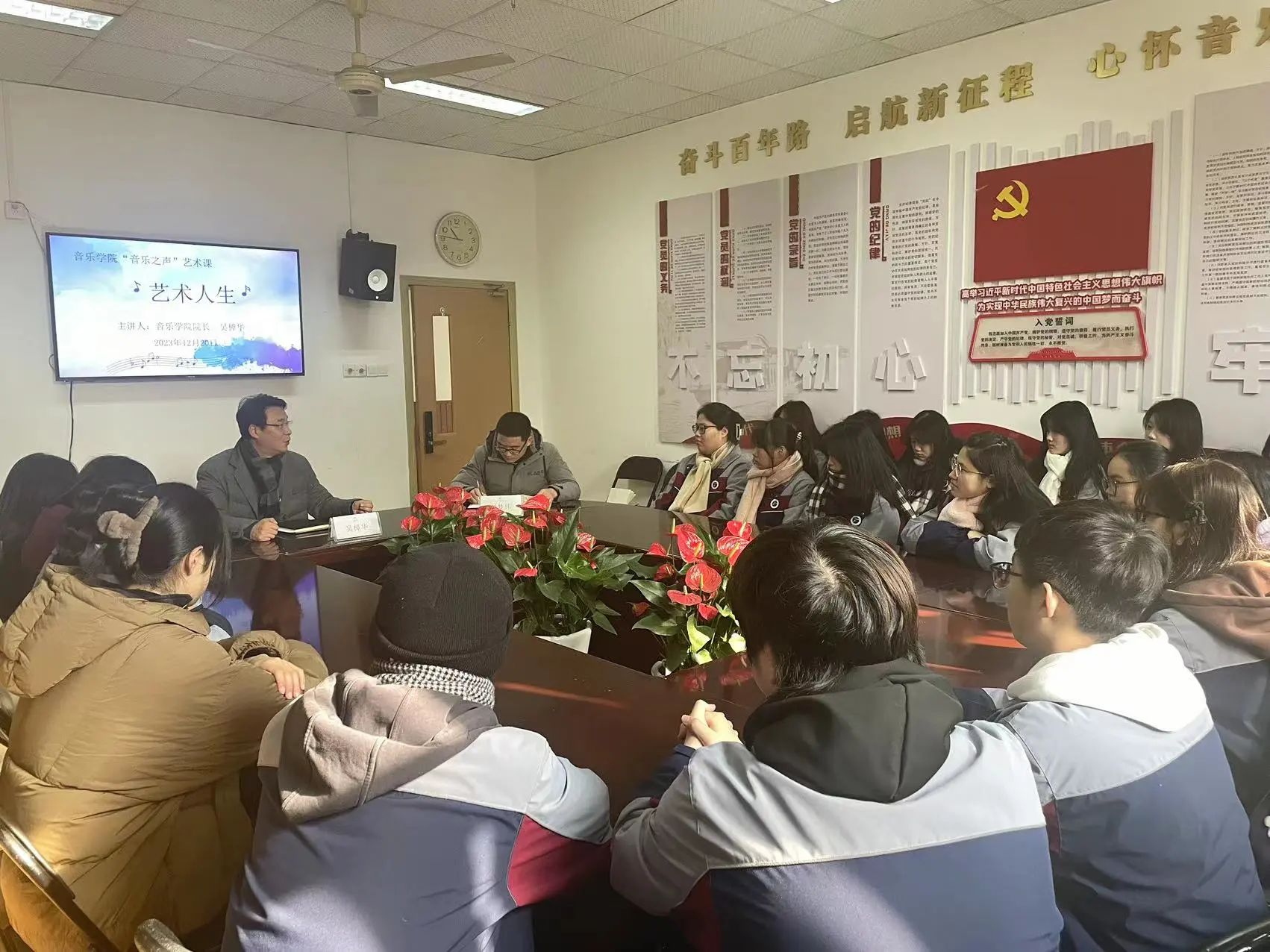 为进一步加强师生沟通与交流,帮助同学们解决学习和生活上的困惑。12月20日,音乐学院组织召开以“艺术人生”为主题的“音乐之声”艺术课。课上,音乐学院院长吴樟华与同学们亲切交流分享了个人的艺术起源和学艺生涯等内容,和同学们共话成长。