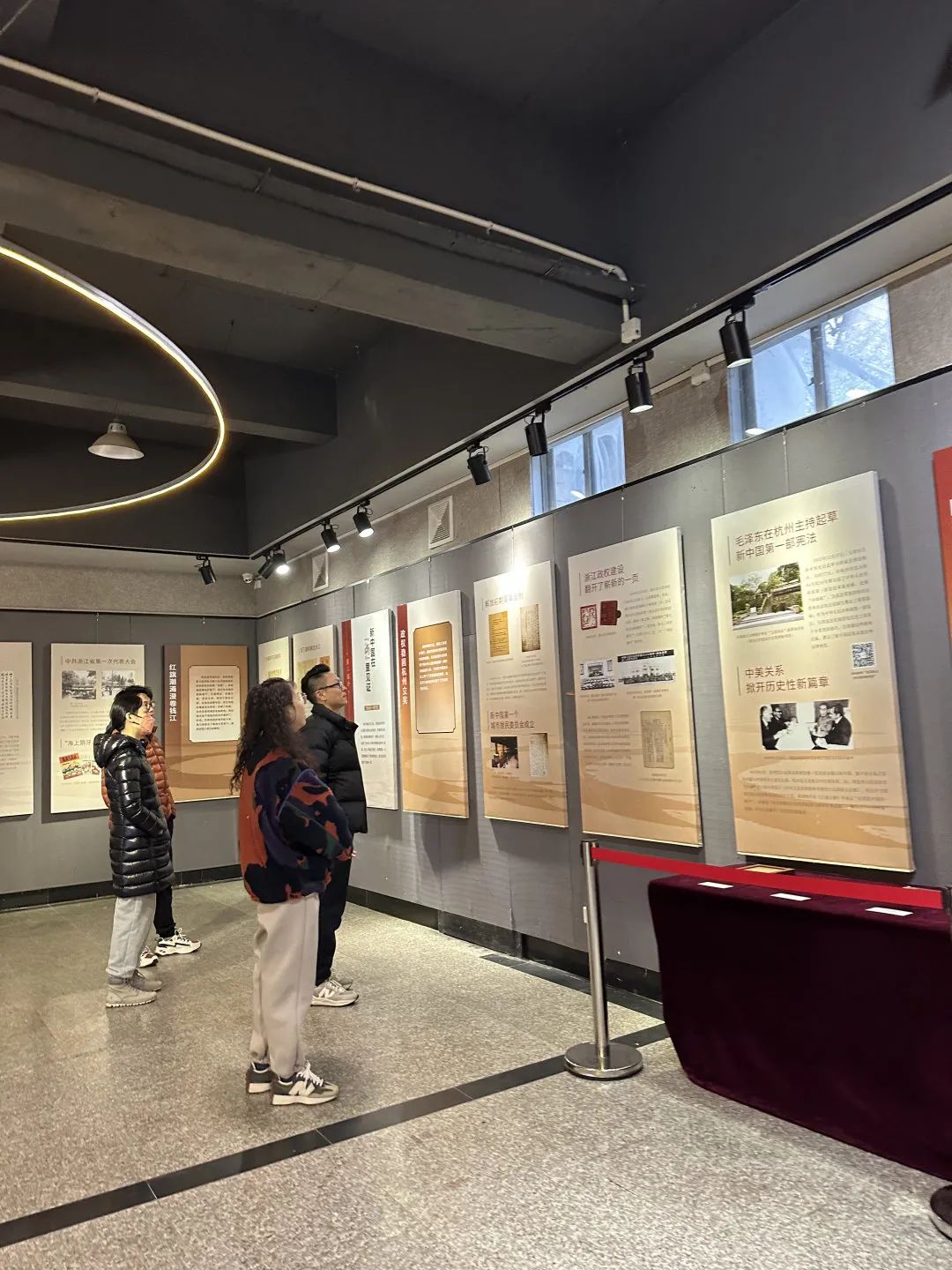 师生在展览中,身临其境的感受中国共产党领导下的浙江革命奋斗史如画卷般展现,艰苦卓绝却波澜壮阔。展览包含“革命火种在“浙”里燃起、新中国在“浙”里见证、改革开放“浙”里先行、新征程“浙”里谱写新篇章”四个单元主题,通过100件具有辨识度的浙江革命文物,以时间逻辑的叙事节奏,讲述中国共产党在浙江的百年风华,庚续中国共产党人的“浙”里信仰。