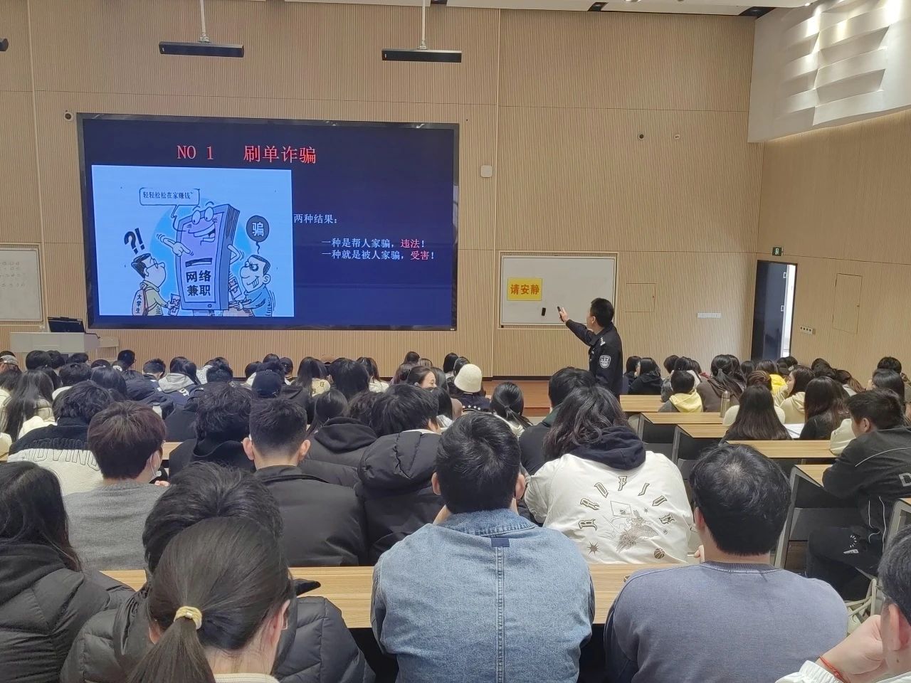 为进一步遏制电信网络诈骗案件发生,增强学生的反诈防骗意识,持续加强反诈宣传教育,切实守护校园安全。3月19日,音乐学院、校保卫处在阶梯二教室联合开展校园防诈骗教育,邀请杭州市公安局滨江分局一级警长沈建松警官主讲,音乐学院全体高职学生参加。