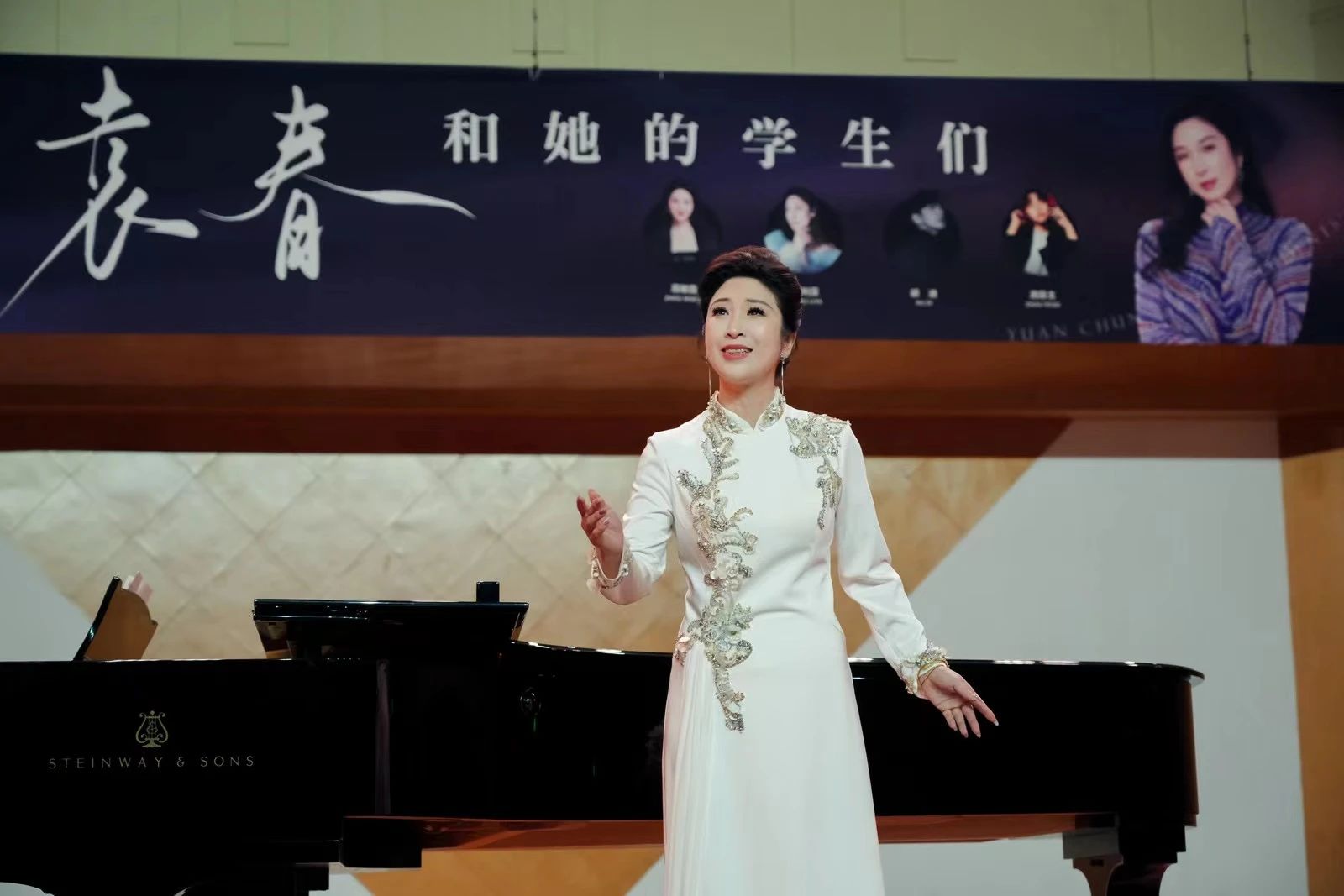 绽放的五月,充满着师生情,5月31日晚,在浙江艺术职业学院音乐厅里,“袁春和她的学生们”一起用歌声表达了对母校的爱。简洁而不简单的舞台,一架钢琴、一幅主题海报显得尤为端庄高雅,来自校内外的师生、嘉宾在开始前半小时,已经将整个音乐厅坐得满满当当。七点演出正式开始,音乐学院副院长章蔓丽一段开场白拉满年青气息,活动背景与领导嘉宾介绍间随意切换,瞬间让大家感受到校园音乐会的与众不同。简短开场白的最后,雷鸣般的掌声迎出了我们当晚的主角——抒情女高音、声乐硕士袁春老师。