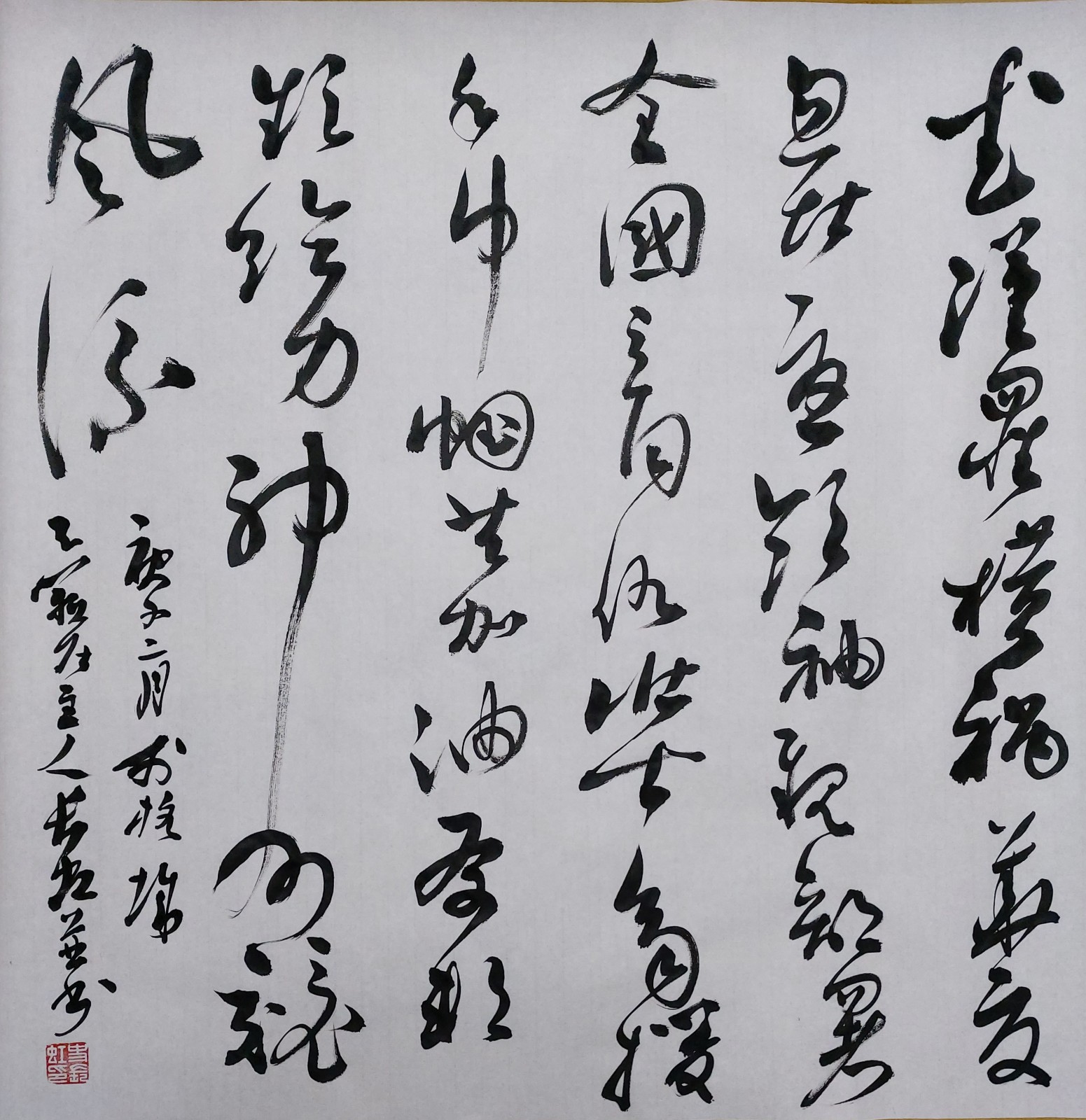 武汉罹横祸,华夏忽堪忧。领袖亲部署,全国立同仇。壮士齐援手,巾帼共加油。友邦频给力,神州竞风流。庚子二月于杭城,天籁居主人长虹并书。