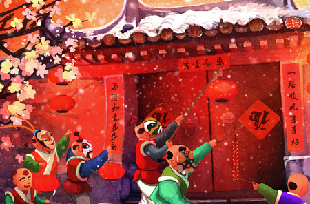 大年初一的江南小村庄,自第一缕曙光划过天际便开始忙碌起来。老人和儿女们一起在自家大门上贴春联,贴福字,挂灯笼,满村庄都是喜气洋洋的。火红的灯笼摇曳着金黄的流苏,红彤彤的光明照亮了团圆的家;滚烫的春联被浓墨点染新年祝愿,寄托着对未来的美好愿望。千家万户张灯结彩祈求多福,几联红纸寄托着中国人的愿望,平仄协调间写的是真诚的祝福。