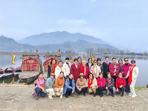 上午8点,满载着欢声笑语的大巴车从学校出发,驶向本次活动的第一站——九姓渔村。漫步在古朴的渔村小巷,村内小桥流水,屋舍俨然,两岸青山如黛,江水盈盈,宛如一幅江南水墨画。古老的捕鱼方式、渔家风俗和传统婚俗“水上婚礼”,老同志们仿佛穿越时空,回到了那个渔歌唱晚的年代。她们感受着浓郁的渔家文化,脸上洋溢着幸福的笑容。